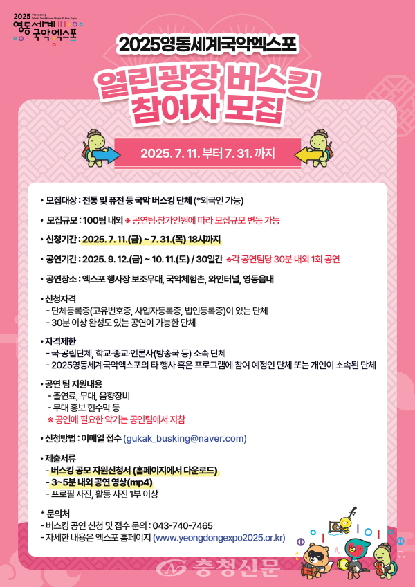 신청은 오는 31일 18:00까지 지원신청서, 공연영상(MP4), 사진 등 필수서류를 이메일(gukak_busking@naver.com)로 접수해야 하며, 8월 8일에 최종 선정 결과가 발표될 예정이다. 자세한 사항은 2025영동세계국악엑스포 공식 누리집(홈페이지)에서 확인할 수 있다.