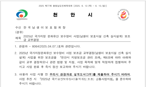 이에 협회는 국가유산청의 보조금을 확보해 보호시설 신축 설계를 추진했고, 천안시는 2025년 3월 설계 보조금 교부 결정을 공식 통보하며 사업 추진을 유도했다 .