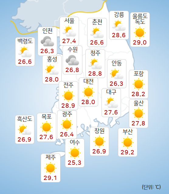 낮 최고기온은 ▲서울 31도 ▲인천 31도 ▲춘천 30도 ▲강릉 34도 ▲대전 31도 ▲전주 33도 ▲광주 34도 ▲대구 34도 ▲부산 31도 ▲제주 32도가 예상된다.