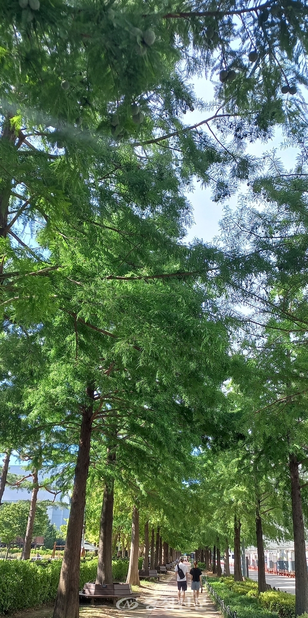 [충청신문=대전] 황천규 기자 = 무더위가 절정으로 치닫고 있는 27일 대전 둔산대공원. 낙우송이 양 옆으로 도열해 만들어진 산책길이 시민들의 쉼터로 각광받고 있다.(사진=황천규 기자)
