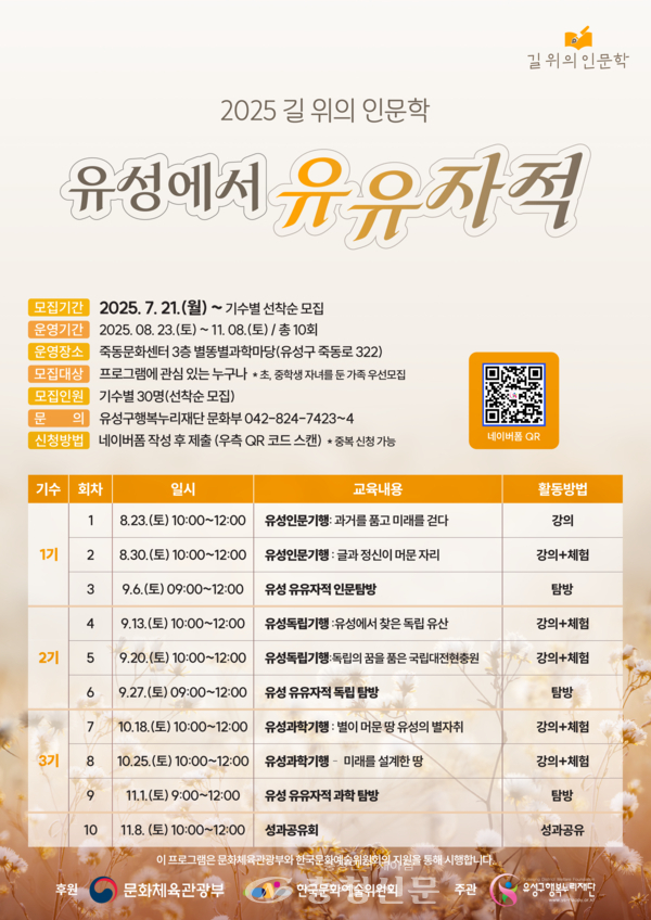 프로그램은 오는 8월 23일부터 11월 8일까지 10회차로 운영되며, 3기수로 나눠 진행된다. 주요 내용은 ▲유교 문화유산인 진잠향교와 숭현서원 탐방 ▲유성의 독립운동 이야기 ▲유성 과학 기행 등으로 구성됐다.