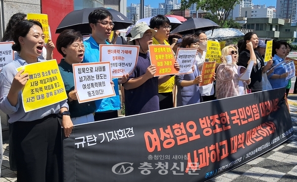 대전여성단체연합, 대전여성폭력방지상담소·시설협의회, 대전시민사회단체연대회의는 29일 국민의힘 대전시당 앞에서 기자회견을 열고 “지난 24일 국민의힘 주요 당직자가 아내를 성착취하고 디지털성범죄와 가정폭력을 저질렀다는 언론 보도 다음날 국민의힘은 당사자의 당직 사퇴 의사를 수용하고, 윤리위원회를 열어 그를 제명시켰다”며 “이는 꼬리 자르기에 급급한 모습으로 책임을 방기하는 것”이라고 비판했다.
