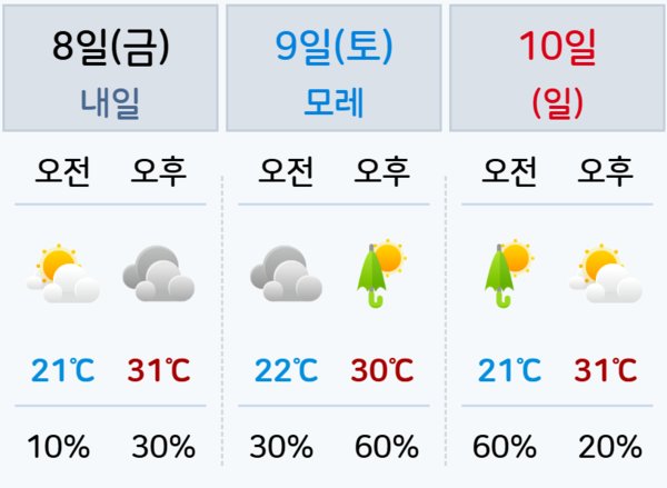 10일은 맑음과 흐림이 반복되는 날씨가 되겠다. 아침 최저기온 20~23도, 낮 최고기온은 30~32도가 될 것으로 보인다.