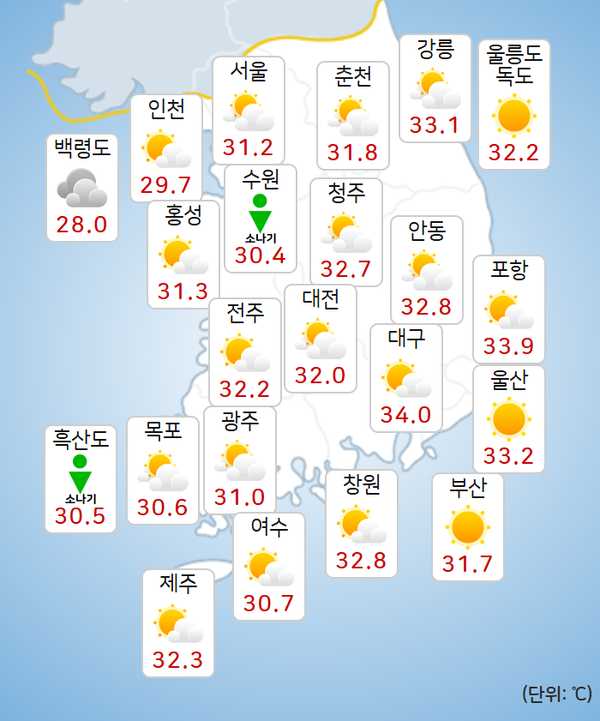 낮 최고기온은 △서울 31도 △인천 30도 △수원 32도 △춘천 32도 △강릉 34도 △청주 34도 △대전 33도 △세종 32도 △전주 34도 △광주 35도 △대구 34도 △부산 32도 △울산 33도 △창원 33도 △제주 33도다.