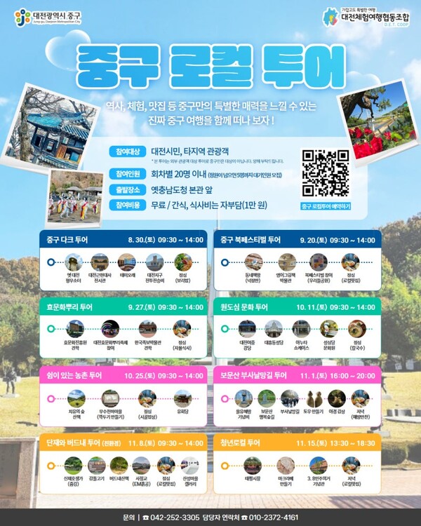 24일 구에 따르면 8가지 테마(8월 30일 다크투어, 9월 20일 북페스티벌투어, 9월 27일 효문화뿌리투어, 10월 11일 원도심 문화 투어, 10월 25일 쉼이 있는 농촌 투어, 11월 1일 보문산 부사날망길 투어, 11월 8일 단재와 버드내 투어, 11월 15일 청년로컬투어)로 구성된 로컬투어는 중구 곳곳에 숨어있는 매력을 찾고 지역 문화와 역사, 이야기를 체험하는 데 중점을 뒀다.