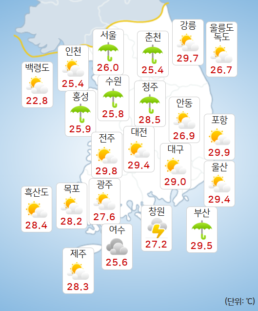 최고기온은 ▲서울 30도 ▲인천 28도 ▲춘천 30도 ▲강릉 33도 ▲대전 30도 ▲대구 34도 ▲전주 31도 ▲광주 32도 ▲부산 31도 ▲제주 32도가 예상된다.