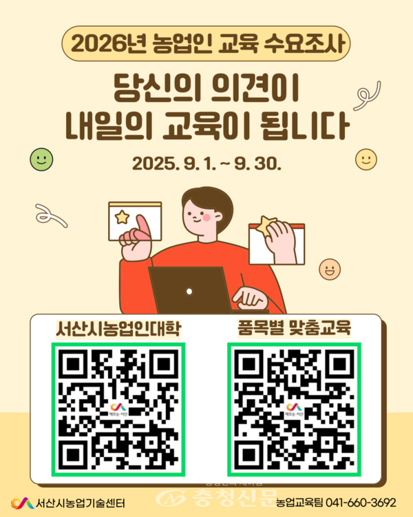 따라서 2026년 서산시 농업인대학과 품목별 영농교육 등으로 나눠 개설 희망 농업교육 과정과 선호하는 교육 방식 등 교육 수요자의 의견을 반영한다.