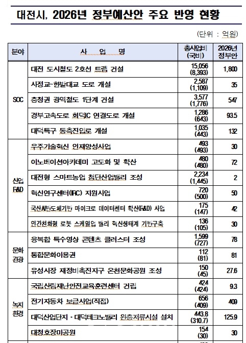 시는 대전도시철도 2호선 트램 건설과 충청권 광역철도 1단계 사업 등 대규모 교통 인프라 예산 대거 반영을 가장 큰 성과로 꼽았다.