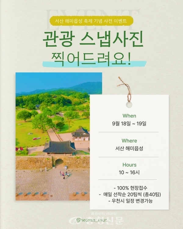 이어 참여자는 촬영 후 제공받은 사진을 개인 사회관계망서비스에 ‘서산 여행’, ‘서산 해미읍성’ 등 해시태그와 함께 게시하면 된다.