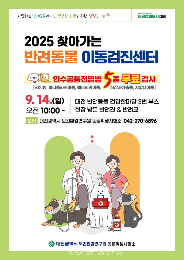 대전시보건환경연구원은 오는 14일 대전반려동물공원에서 열리는 ‘반려동물 건강한마당’ 행사에 맞춰 ‘찾아가는 반려동물 이동검진센터’를 운영한다고 10일 밝혔다.