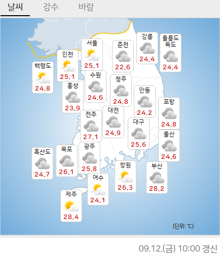 주요 도시별, 지역별 아침 최저기온은 △서울 21도 △인천 22도 △춘천 17도 △강릉 19도 △대전 21도 △대구 20도 △전주 21도 △광주 21도 △부산 24도 △제주 25도 △울릉도 독도 22도다.