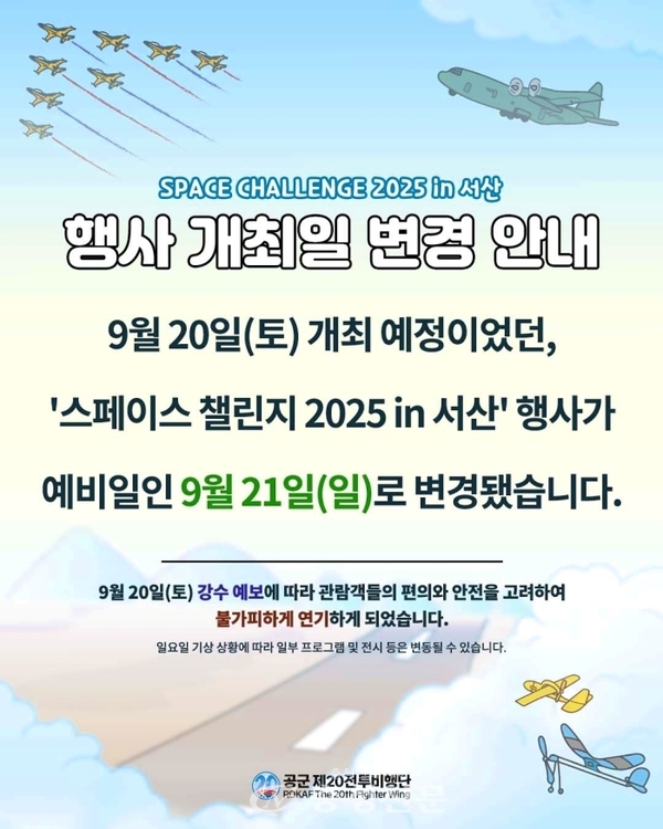 20전비 관계자는 “안전하고 원활한 행사 진행을 위해 일정을 하루 연기했다”며 “부대를 찾는 관람객들은 행사 당일까지 공식 홈페이지(www.spacechallenge.kr)를 통해 에어쇼 일정 등 최신 정보를 다시 확인해달라"고 당부했다.