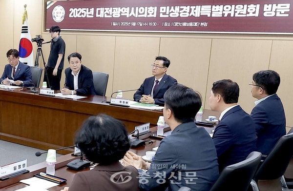 [충청신문=대전] 최일 기자 = 대전시의회 민생경제특별위원회 이상래 위원장과 위원들이 지난 17일 대전신용보증재단을 방문, 지역경제 활성화를 위한 금융 지원책이 제대로 작동하는지 확인하고, 소상공인과 중소기업의 숨통을 트여줄 특단의 대책에 관해 의견을 나누고 있다. (사진=대전시의회 제공)