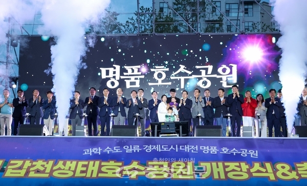 한편, 이날 개장식에는 지역 기관·단체장과 시민 6000여명이 함께해 갑천생태호수공원 탄생을 자축하고, 장민호·알리·정동하·김의영 등 인기 가수들의 공연과 지역 전문예술인들의 축하 공연, 불꽃쇼, 레이저쇼 등을 즐겼다.