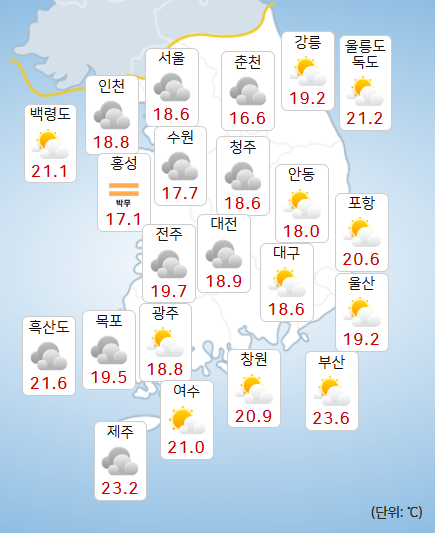 낮 최고기온은 서울 25도, 인천 24도, 수원 24도, 춘천 24도, 강릉 25도, 청주 25도, 대전 24도, 전주 25도, 광주 25도, 대구 25도, 부산 27도, 제주 26도가 예상된다.