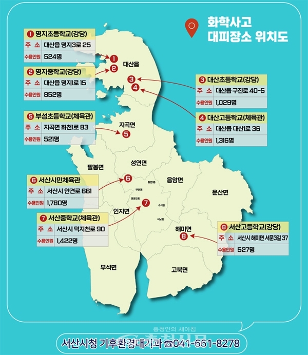 아울러 환경부 지침에 따라 서산시는 모두 8곳의 화학 사고 대피장소를 지정, 운영 중이다.
