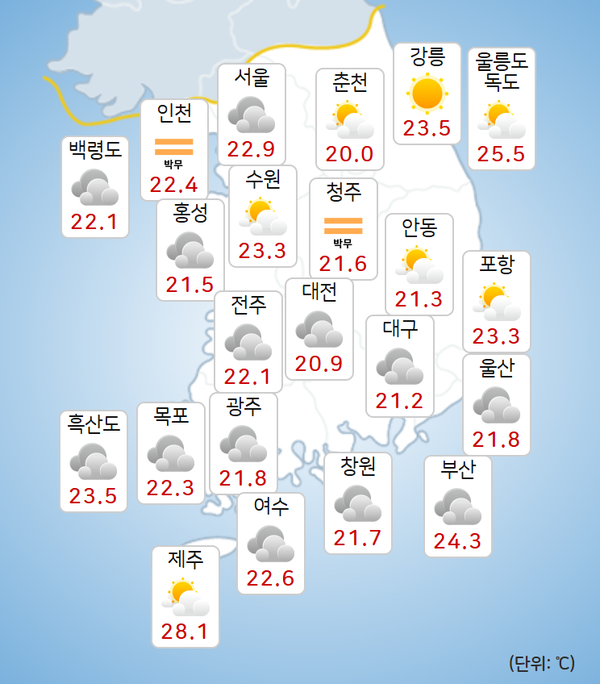 아침 최저기온은 14∼20도, 낮 최고기온은 24∼27도로 전망된다.