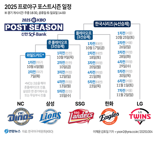 와일드카드 결정전 승자는 9일부터 3위 SSG랜더스와 준PO(5전 3선승제)를 치르고, 준PO 승자는 17일부터 한화와 PO(5전 3선승제)에서 맞붙어 한국시리즈(7전 4선승제) 진출 팀을 가린다.