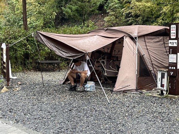 산책로를 지나 한 구석에 자리한 야영장에선 비를 흠뻑 맞는 텐트와 캠핑카 안으로 따뜻한 차와 다과를 나누며 비 오는 숲 풍경을 바라보는 가족들이 있었다. 아이들은 야영장 인근 당나귀 체험장에서 직접 당나귀를 타보거나 먹이를 주며 즐거운 시간을 보내기도 했다.