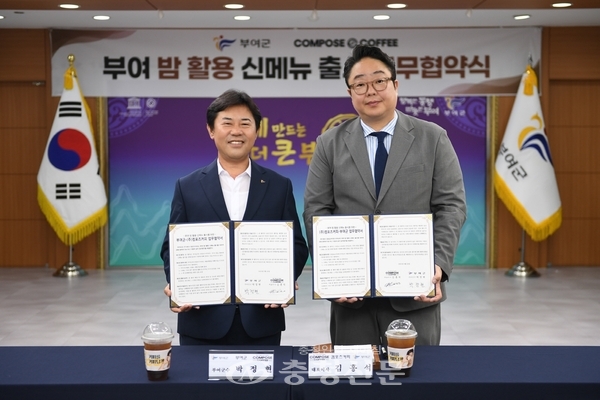 이번 협약에 따라 부여군은 지역 농특산물의 우수성을 알리며, 지역 브랜드 가치를 향상하고, 컴포즈커피는 부여 밤을 원재료로 활용한 신메뉴를 새롭게 선보인다.