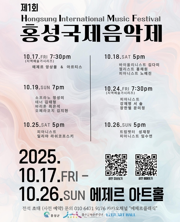 한편 에제르아트홀은 행사를 통해 지역 예술인과 외부 전문 연주자의 교류를 확대하고 홍성을 대표하는 정기 음악 축제로 발전시켜 나갈 계획으로 클래식 입문자부터 애호가까지 다양한 세대가 함께 즐길 수 있는 무대를 제공해 지역 문화예술의 자립 기반을 다지고 관광객 유입을 통한 지역 활성화에도 기여할 것으로 전망되고 있으며 공연 사전예약 및 자세한 사항은 카카오채널 ‘에제르클래식’채널 추가를 통해 확인할 수 있다.
