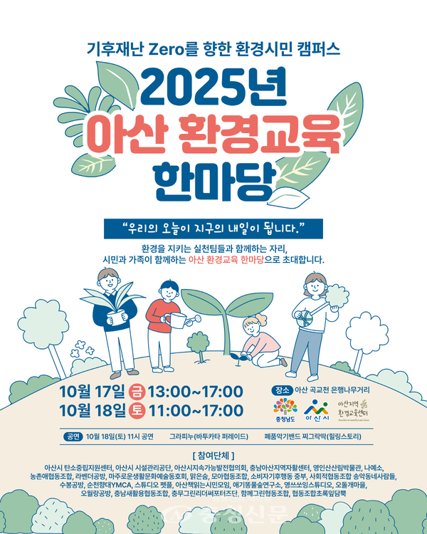 환경교육의 성과는 시민 축제로 이어지고 있다. 2022년 시작된 ‘환경교육 한마당’은 해마다 참여 규모를 넓히며 대표 시민참여형 행사로 자리 잡았다. 오는 10월 17~18일에는 곡교천 여해나루 일원에서 ‘기후재난 Zero를 향한 환경시민 캠퍼스’를 주제로 ‘2025 환경교육 한마당 및 탄소중립 실천 확산대회’가 열린다. 아산시와 교육지원청, 27개 협의체 기관이 공동 주관하는 이번 행사는 환경교육도시 지정을 향한 시의 의지와 성과를 공유하는 장이 될 전망이다.