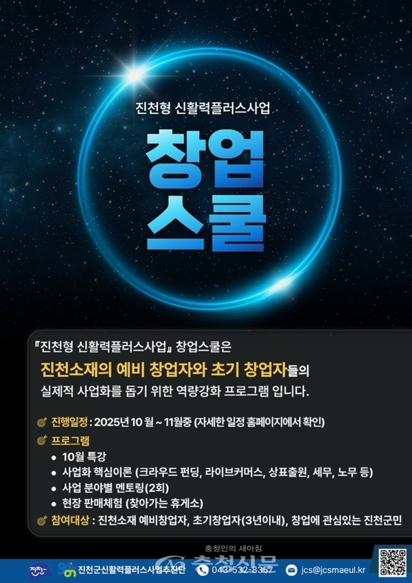 이번 과정은 인기 강사의 창업 특강을 시작으로, 관내 초기 창업자와 창업에 관심 있는 진천군민을 대상으로 이론 학습과 현장 경험을 단계별로 체험할 수 있는 교육을 진행한다.