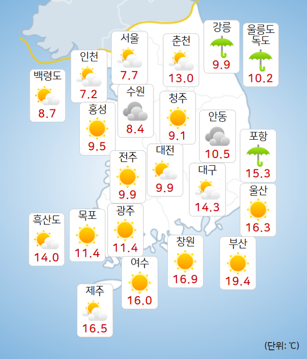 주요 지역 아침 최저기온은 서울 5도, 인천 4도, 수원 4도, 춘천 7도, 강릉 11도, 청주 6도, 대전 5도, 세종 5도, 전주 7도, 광주 8도, 대구 10도, 부산 15도, 울산 11도, 창원 12도, 제주 15도다.