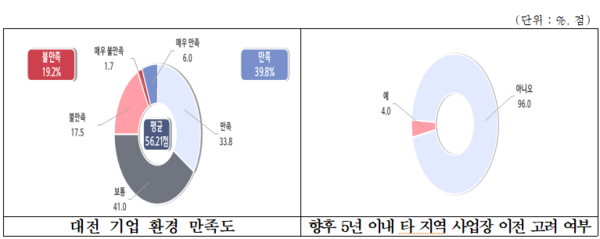 조사 결과, 대전 기업의 전반적 경영 환경 평가는 100점 만점에 평균 56.2점으로 ‘보통’ 수준으로 나타났다. 응답자의 39.8%는 ‘만족’한다고 답했고 ‘불만족’ 응답(19.2%)보다 2배가량 높았다.