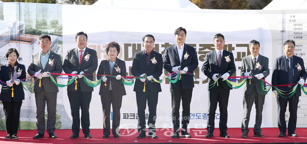 [충청신문=대전] 최일 기자 = 3일 대전 천동중학교(가칭) 신축공사 기공식이 동구 천동 92-1번지 학교 부지에서 열려 박희조 동구청장(가운데), 장철민 국회의원(오른쪽 네 번째) 등이 테이프 커팅에 앞서 기념촬영을 하고 있다. 총사업비 247억원을 투입, 지하 1층 지상 4층 규모로 건립될 천동중은 오는 2027년 3월 개교를 목표로 한다. (사진=동구 제공)