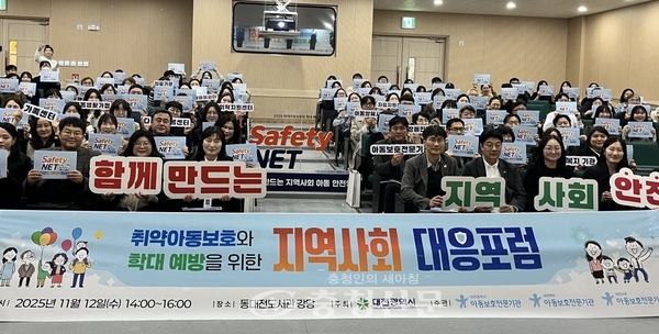 [충청신문=대전] 최일 기자 = 12일 동대전도서관 강당에서 ‘취약 아동 보호와 학대 예방을 위한 지역사회 대응 포럼’이 열려 참석자들이 기념촬영을 하고 있다. 이날 포럼은 대전시가 주최하고, 지역 아동보호전문기관들이 공동주관했다. (사진=대전시 제공)