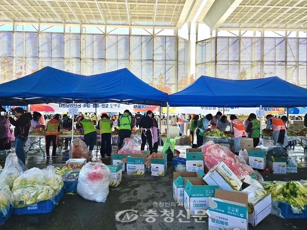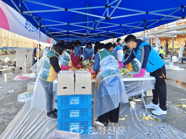 [충청신문=대전] 김해인 기자 = 12일 오전 대전 엑스포시민광장에서 열린 ‘제17회 따뜻한 겨울나기 김장대봉사’ 현장에서 자원봉사자들이 배추 속을 버무리고 있다. (사진=김해인 기자)