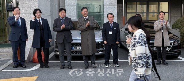 [충청신문=대전] 남수현 기자 = 2026학년도 대학수학능력시험이 치러지는 13일 설동호 대전시교육감(왼쪽)을 비롯한 교육청 관계자들과 동대전고 학교장이 제27시험지구 제8시험장 동대전고등학교에서 수험생들에게 응원의 메시지를 전하고 있다. (사진=남수현 기자)