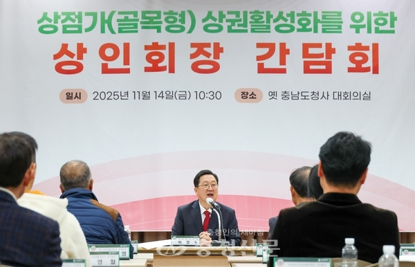 [충청신문=대전] 최일 기자 = 이장우 대전시장이 지난 14일 중구 선화동 옛 충남도청 대회의실에서 지역 내 80개 상점가(골목형) 상인회장들과 상권 활성화를 위한 간담회를 갖고 있다. 이 자리에서 이 시장은 “시의 모든 역량을 집중해 상권 경쟁력을 강화하고, 지속가능한 상권 생태계를 조성하겠다”고 말했다. (사진=대전시 제공)