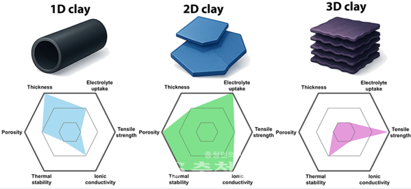 그 결과, 점토광물 코팅 분리막은 기존 폴리올레핀계 분리막 대비 전해질 흡수율이 5배 이상 높아졌으며, 열 안정성·기계적 내구성·이온전도도 등 주요 성능이 모두 향상된 것으로 나타났다.