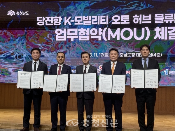 김태흠 지사는 17일 도청 대회의실에서 오성환 당진시장, 이정환 SK 렌터카 대표이사 등과 케이(K)-모빌리티 오토 허브 일반물류단지 조성 사업 추진을 위한 업무협약을 체결했다.