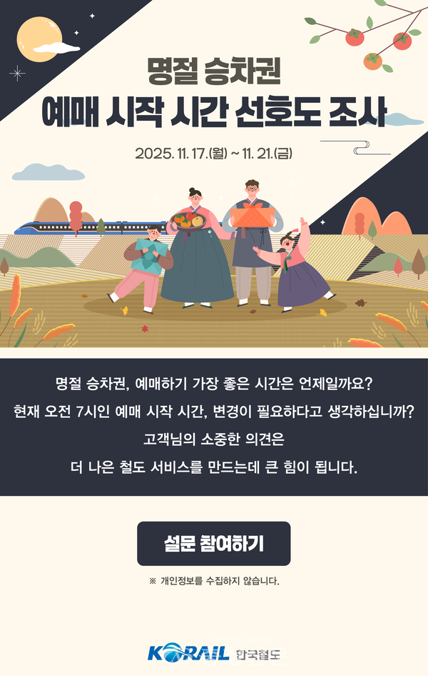 이민성 고객마케팅단장은 “국민의 의견을 폭넓게 반영해 명절 승차권 예매 환경을 더욱 편리하게 만들겠다”며 “제도와 시스템 개선을 지속적으로 추진하겠다”고 말했다.