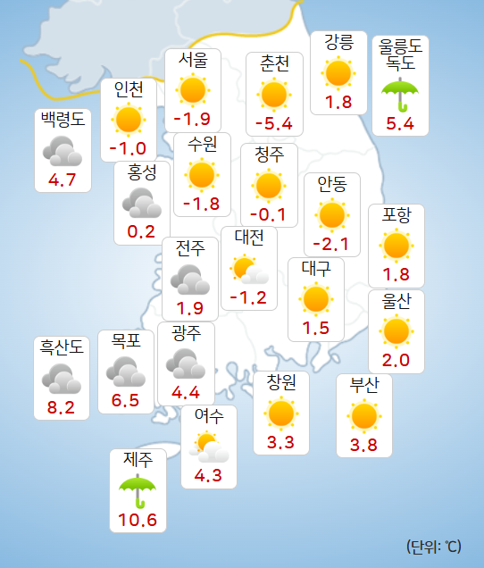 낮 최고기온은 5~12도에 머물며 종일 차갑다. 서울과 대전, 전주가 모두 7도에 그치고, 부산 10도, 제주 12도로 남부 해안도 큰 폭의 온도 상승은 없겠다.