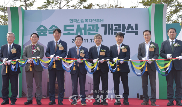 [충청신문=대전] 하서영 기자 = 17일 대전 서구 관저동 산림복지종합교육센터에서 열린 숲속 도서관 개관식에서 주요 내빈들이 테이프 커팅에 앞서 기념촬영을 하고 있다. 왼쪽부터 조규식 대전 서구의회 의장, 서철모 서구청장, 최성아 대전시 정부경제과학부 부시장, 박병석 제21대 국회의장, 남태헌 한국산림복지진흥원 원장, 송준호 산림청 산림복지국 국장, 이태진