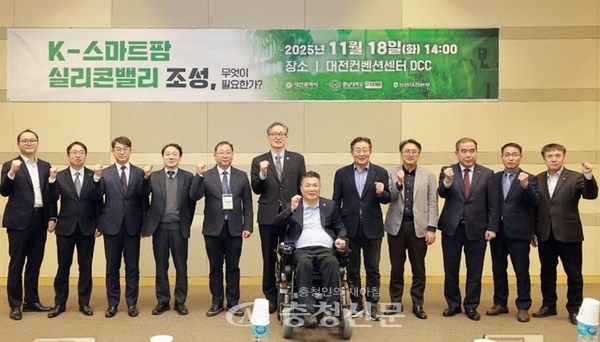 [충청신문=대전] 최일 기자 = 18일 대전컨벤션센터에서 ‘K-스마트팜 실리콘밸리 조성, 무엇이 필요한다’를 주제로 스마트농업 정책포럼이 열려 참석자들이 기념촬영을 하고 있다. 이날 행사는 대전시와 충남대 그린바이오혁신융합대학사업단이 공동주관했다. (사진=대전시 제공)