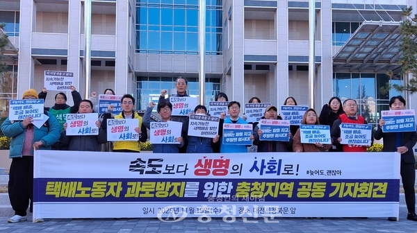 전국택배노조 충청지부, 민주노총 대전지역본부, 대전시민사회단체연대회의 등은 19일 대전시청 앞에서 ‘택배노동자 과로 방지를 위한 충청지역 공동 기자회견’을 열고 “택배노동자들은 장시간 노동의 굴레에서 벗어나지 못하고 있다. ‘로켓배송’, ‘심야배송’, ‘365일 배송’ 등 업체 간 살인적인 속도 경쟁은 노동자들을 과로사로 내몰고 있다”고 개탄했다.