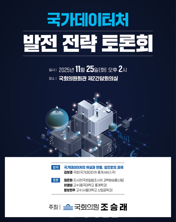 행사는 국가데이터처 김보경 국장의 ‘국가데이터처의 위상과 현황, 앞으로의 과제’를 주제로 한 발제로 시작된다. 이후 ▲국회입법조사처 정준화 조사관, ▲동국대학교 통계학과 이영섭 교수, ▲서울대학교 산업공학과 황보현우 교수가 AI 시대 국가데이터처의 역할, 국가데이터처 발전방향, 해외사례를 중심으로 한 통계-데이터 거버넌스 전략 등을 주제로 토론을 이어나갈 예정이다.