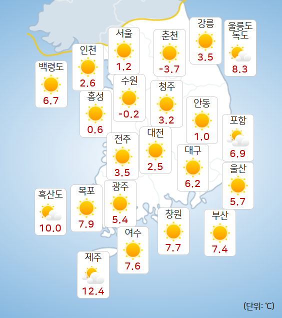 ▲서울 1도 ▲인천 2도 ▲수원 -1도 ▲춘천 -4도 ▲강릉 4도 ▲청주 1도 ▲대전 2도 ▲전주 3도 ▲광주 4도 ▲대구 3도 ▲부산 7도 ▲울산 4도 ▲제주 12도다.