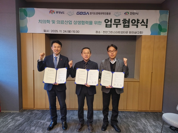 도는 24일 천안시 그린스탙트업타운에서 천안시, 경기도경제과학진흥원과 국립치의학연구원 천안 설립 및 치의학산업 육성을 위한 초광역 협력 업무협약을 체결했다.