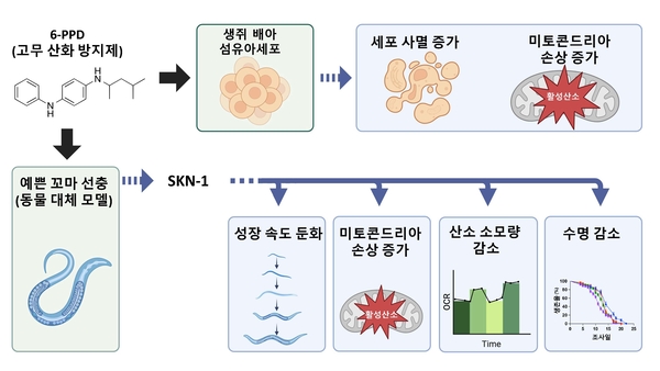 이번 연구는 미국 플로리다대 한성민 교수 연구팀, 미국 브로디 의과대학(ECU) 이면희 교수 연구팀과 협력해 진행됐으며, 동물 대체시험 모델인 예쁜꼬마선충(C. elegans)과 세포주 모델에서 6-PPD 물질이 노화, 건강 수명, 미토콘드리아 기능에 미치는 영향을 분석했다.