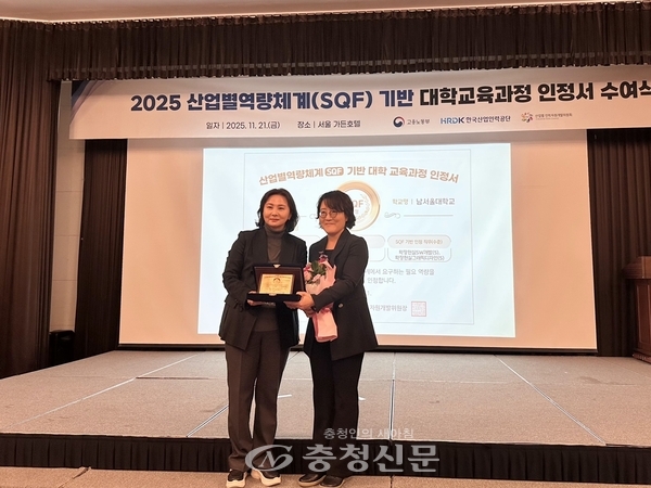 남서울대 가상현실학과는 21일 서울가든호텔에서 열린 ‘산업별역량체계(SQF) 기반 대학 교육과정 인정서 수여식’에서 고용노동부·한국산업인력공단으로부터 정식 인증을 획득했다. 올해 인정 대상으로 선정된 17개 대학 가운데 하나로, XR 분야 교육 경쟁력을 입증한 셈이다.